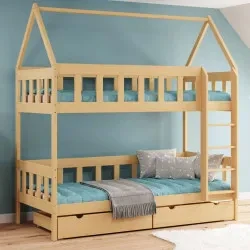 Model LUKO je patrová postel ve tvaru domu ve skandinávském stylu. Postel je vyrobena z lepeného laminovaného borovicového dřeva a má broušené hladké, se zaoblenými tvary.
