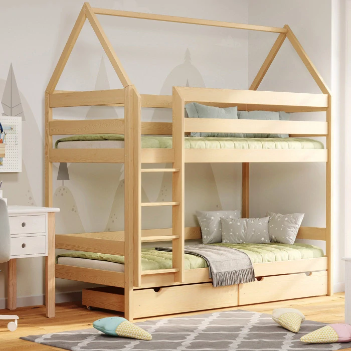 Model LUNA je patrová postel ve tvaru domu ve skandinávském stylu. Postel je vyrobena z lepeného laminovaného borovicového dřeva a má broušené hladké, se zaoblenými tvary.