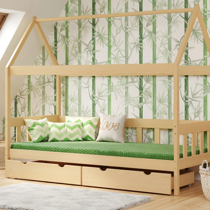 Postele vyrábíme z lepeného borovicového dřeva třídy kvality 1 původem ze zemí EU. Používáme lepené dřevo, protože je při nižší tloušťce daleko pevnější, bez suků a navíc se nekroutí. Dřevo je hoblované dohladka se zaoblenými hranami, aby se malým pokladům nic nestalo. Postele dodáváme přírodní bez jakýchkoli chemických úprav – nemoříme je ani nelakujeme. Jedná se tedy o přírodní, dobře vysušené dřevo.