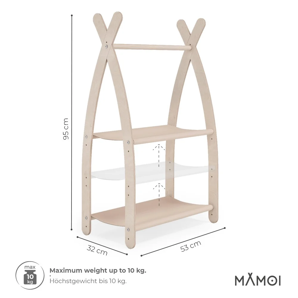 Montessori dětská šatní skříň má malé rozměry a nízko posazenou tyč, proto se skvěle hodí do pokoje ročního dítěte. Otevřený design umožňuje volný přístup k oblečení. Šatní skříň je rozdělena na dvě zóny: závěsné a stohovací věci.