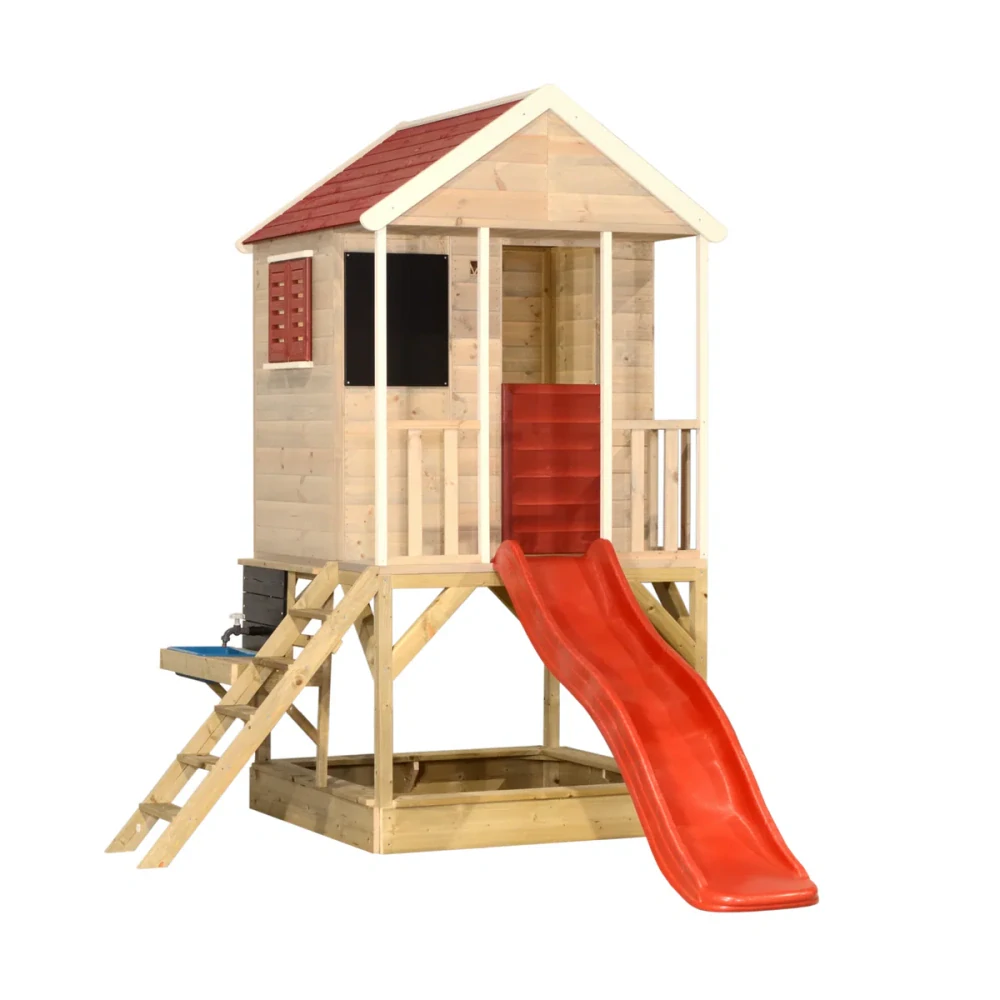 Tento domeček, postavený na 90 cm vysoké plošině, je navržen tak, aby vaše dítě zůstalo aktivní a zaujaté. Pod plošinou se nachází pískoviště, ideální pro vaše nejmenší, kde si mohou stavět hrady z písku a prozkoumávat svou kreativitu. V přední části domečku je připevněná 175 cm dlouhá plastová skluzavka, která jistě poskytne hodiny vzrušující zábavy.
