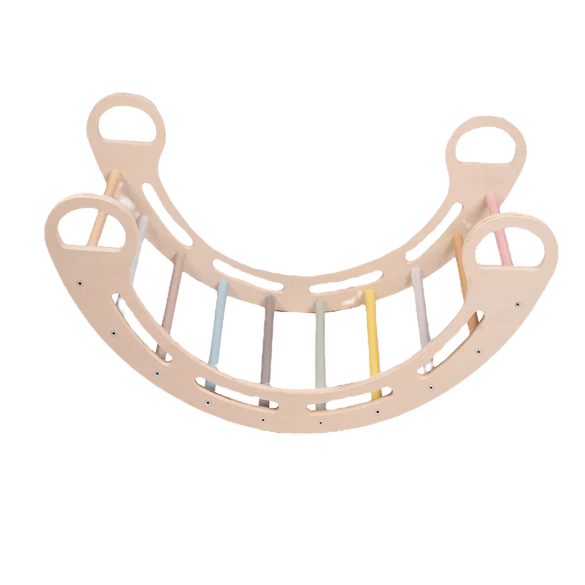 Tato Montessori houpačka (bujak) je vyrobena z kvalitního přírodního dřeva a navržena tak, aby podporovala přirozený pohyb, kreativitu a samostatnou hru dětí. Stabilní oblouková konstrukce s příčnými tyčkami v jemných pastelových barvách nabízí bezpečné a všestranné využití doma i v dětském pokoji.