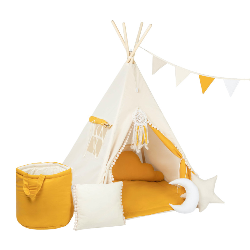 Týpí domeček se bezesporu stane jednou jednou z oblíbených her těch nejmenších. Omezený prostor stanu a příjemné vzory látek dodávají dítěti pohodlí a pocit bezpečí. Batole si dovnitř může vzít své oblíbené hračky nebo knížky a použitím dalších doplňků, jako jsou lampičky či různá světýlka, můžete uvnitř navodit příjemnou atmosféru. Děti rády používají týpí ke zklidnění před spaním. Pohodlná a měkká podložka, přivázaná k rámu bavlněnými provázky, je stabilním základem pro zcela bezpečnou hru a občas poslouží jako matrace, na které si můžete zdřímnout.