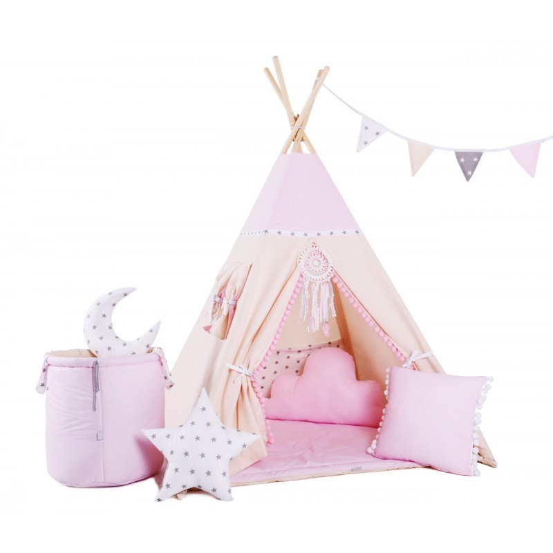 Týpí domeček se bezesporu stane jednou jednou z oblíbených her těch nejmenších. Omezený prostor stanu a příjemné vzory látek dodávají dítěti pohodlí a pocit bezpečí. Batole si dovnitř může vzít své oblíbené hračky nebo knížky a použitím dalších doplňků, jako jsou lampičky či různá světýlka, můžete uvnitř navodit příjemnou atmosféru. Děti rády používají týpí ke zklidnění před spaním. Pohodlná a měkká podložka, přivázaná k rámu bavlněnými provázky, je stabilním základem pro zcela bezpečnou hru a občas poslouží jako matrace, na které si můžete zdřímnout.