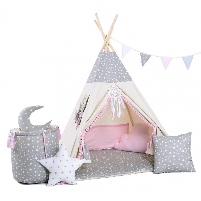 Týpí domeček se bezesporu stane jednou jednou z oblíbených her těch nejmenších. Omezený prostor stanu a příjemné vzory látek dodávají dítěti pohodlí a pocit bezpečí. Batole si dovnitř může vzít své oblíbené hračky nebo knížky a použitím dalších doplňků, jako jsou lampičky či různá světýlka, můžete uvnitř navodit příjemnou atmosféru. Děti rády používají týpí ke zklidnění před spaním. Pohodlná a měkká podložka, přivázaná k rámu bavlněnými provázky, je stabilním základem pro zcela bezpečnou hru a občas poslouží jako matrace, na které si můžete zdřímnout.
