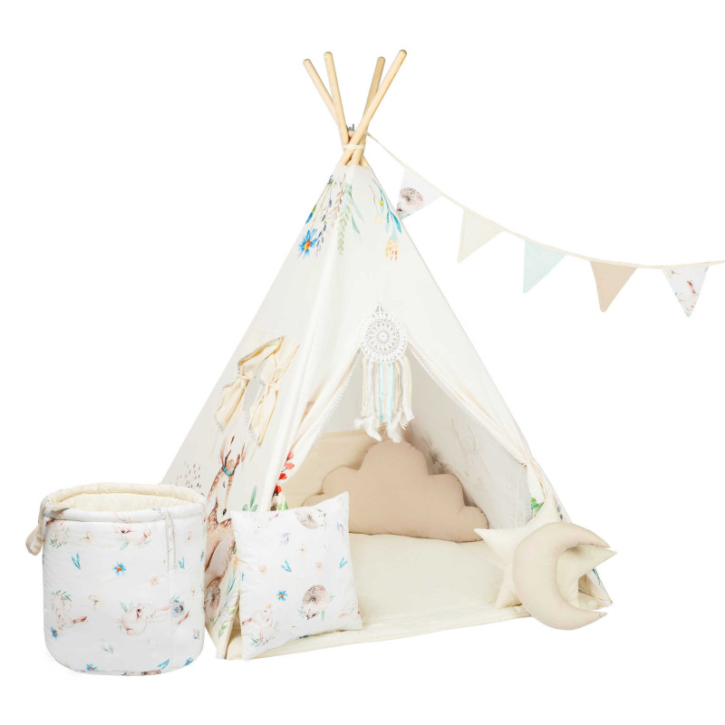 Týpí domeček se bezesporu stane jednou jednou z oblíbených her těch nejmenších. Omezený prostor stanu a příjemné vzory látek dodávají dítěti pohodlí a pocit bezpečí. Batole si dovnitř může vzít své oblíbené hračky nebo knížky a použitím dalších doplňků, jako jsou lampičky či různá světýlka, můžete uvnitř navodit příjemnou atmosféru. Děti rády používají týpí ke zklidnění před spaním. Pohodlná a měkká podložka, přivázaná k rámu bavlněnými provázky, je stabilním základem pro zcela bezpečnou hru a občas poslouží jako matrace, na které si můžete zdřímnout.