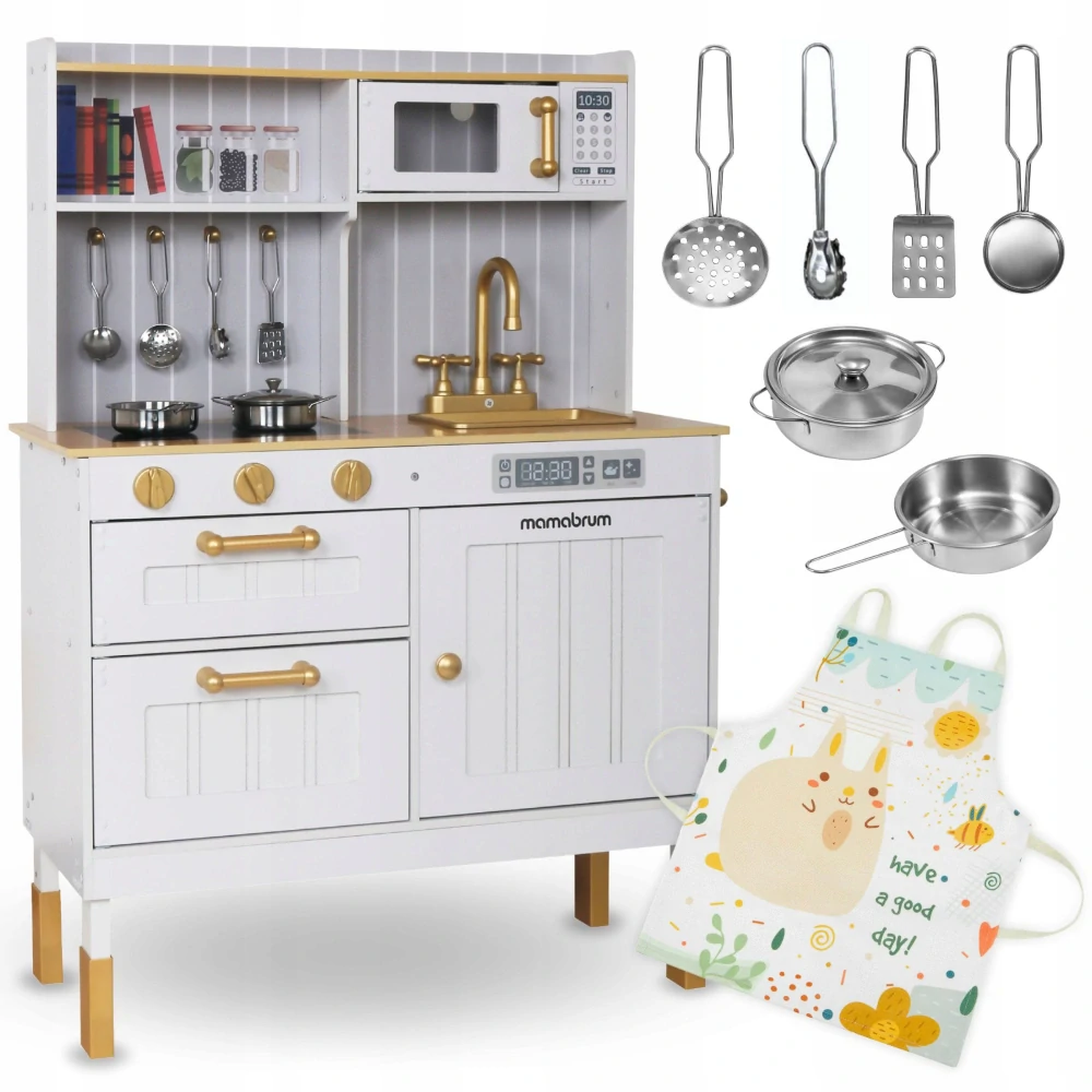 Sleduje vás vaše dítě často v kuchyni? Batolata ráda napodobují dospělé, a tak ho zábava při přípravě chutných jídel jistě osloví. Dřevěná kuchyně je zábavou mnoha různými způsoby. Její moderní design s deskou z přírodního dřeva a bílými skříňkami efektně upoutá dětskou pozornost a dělá z kuchyně ozdobu pokojíčku.